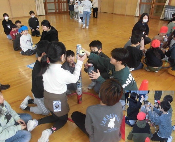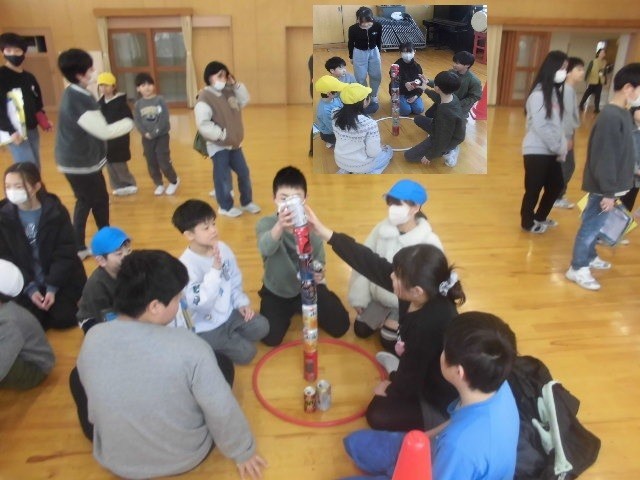 全校集会、サブアリーナでは、縦割り班ごとに「アルミ缶積み」に挑戦しました。協力して乗せたり、支えたり、「~のようにするといいね」と相談したりする姿が見られました。10本近く高く積み上げた班もあれば、最後に揺れて倒れて残念がる班もあり、ドキドキ楽しみました。