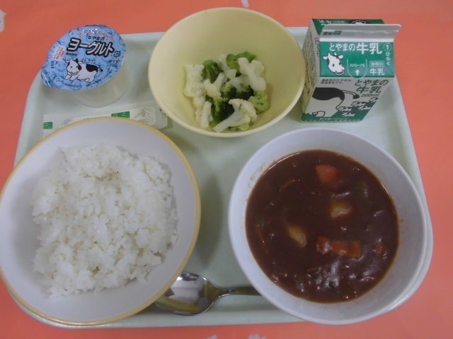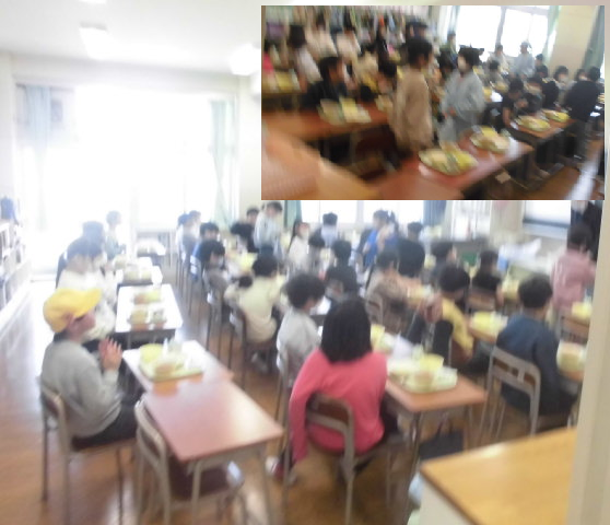 今日の給食は「食べキリンハヤシライス、花野菜サラダ、ヨーグルト」でした。画像は、残念ながら数人の友達が休んでいるため、多くお代わりできる3年生の様子。