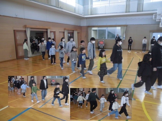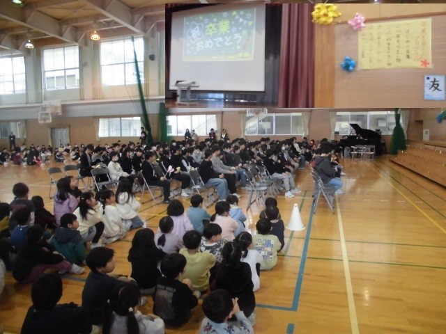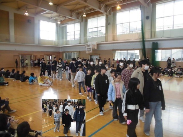3月3日(火)、卒業お祝い集会を行いました。5年生が準備をして、全校で出し物やプレゼントを計画しました。まずは、6年生が1年生と手をつないで入場です。