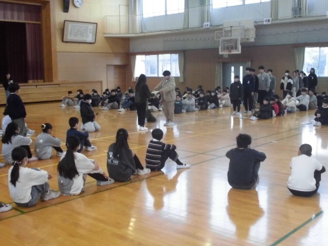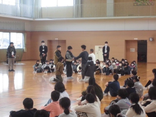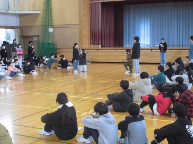 体育館に4~6年生が集まり、児童会(委員会)引き継ぎ式を行いました。委員会ごとに、6年生から5年生へがんばった活動や引き継いでほしいことを、5年生から6年生へ感謝や来年度の抱負などを伝えました。4年生も、その様子をしっかりと見て、来年度、高学年になる思いを高めたようです。