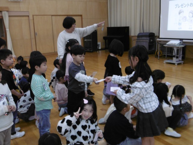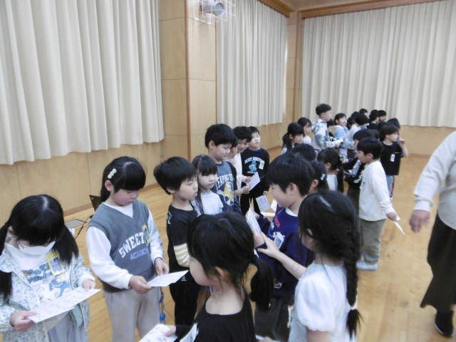 最後に、「アサガオの種」をプレゼントすると、1年生からは名前を書いた「名刺」をもらいました。これをきっかけに、1年生と仲良しになっていきたいと思います。