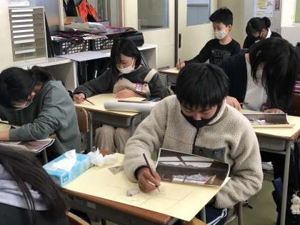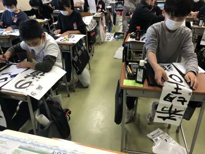 写真は書き初め練習で一画一画心を込めて取り組んでいる様子、算数や図工で与えられた課題を一生懸命に取り組む様子です。黙々と集中する姿が6年生らしく大変素晴らしいです。
