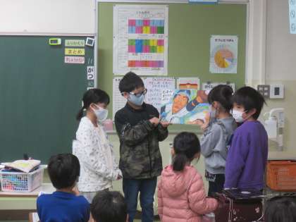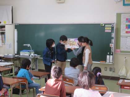 国語科の学習「はんで意見をまとめよう」で相談して決めた絵本を手に、1年生への読み聞かせに行ってきました。1年生にとって聞きやすい声で読むことや絵が見やすいような立ち方を工夫しながら練習し、緊張しながらも堂々と読み聞かせをしてくることができました。