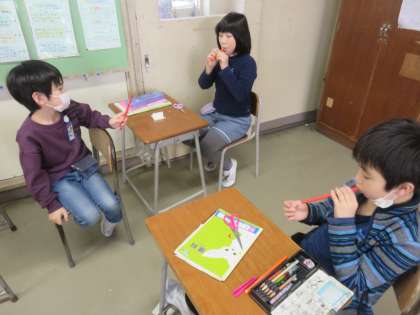 理科では音の学習をしています。音がでるとき、物の様子はどうなっているかを2種類の紙笛で調べました。なかなか音が出ず苦戦しましたが、音が出た子供たちは嬉しそうに「わ、震えてるよ!」と声をあげていました。