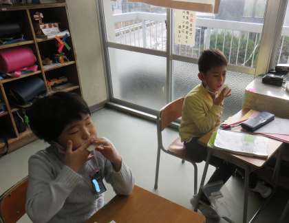 理科では音の学習をしています。音がでるとき、物の様子はどうなっているかを2種類の紙笛で調べました。なかなか音が出ず苦戦しましたが、音が出た子供たちは嬉しそうに「わ、震えてるよ!」と声をあげていました。
