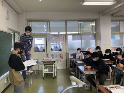 国語科では狂言「柿山伏」を学習しています。狂言に初めて出会った子どもが多いのですが、読むと面白く、夢中になって音読しています。「独特のリズムをつかみ、真似しみよう」「すらすらと覚えるほどに音読しよう」「動きをつけて表現しよう」などとそれぞれが音読の目当てをもち、楽しみながら狂言に親しんでいます。