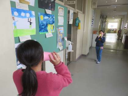 理科の学習では、音が伝わるとき、音を伝える物は震えているかを糸電話を使って実験しました。糸の張り方を工夫したり、しゃべっているときに糸をつまんだりしながら、楽しく実験していました。糸電話をすることが初めての子も多く、友達の声が聞こえたときの笑顔がとてもかわいらしかったです。