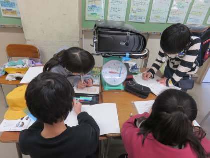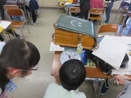 算数科の「重さ」の学習では、ランドセルの重さをはかりで量る活動に取り組みました。学習したkg(キログラム)の単位を用いて、ランドセルの重さを正確に表そうと真剣にはかりとにらめっこをする子供たちでした。