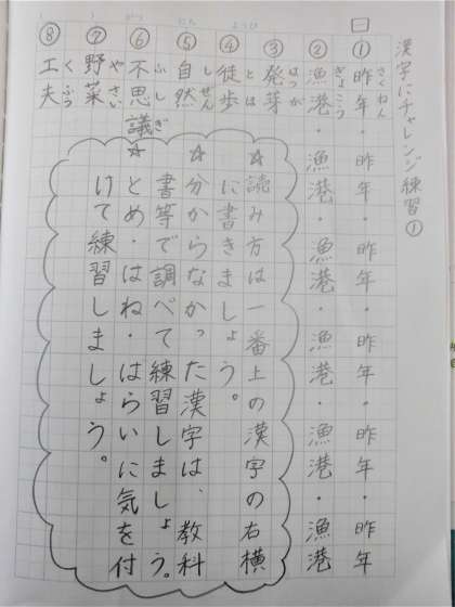 ・8日(金)に出された宿題プリント「漢字にチャレンジ 練習1」に出ている問題の熟語を国語ノートに一列ずつ練習する。(練習の仕方は写真を参考にしましょう。)