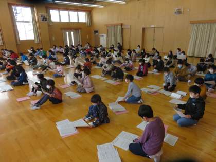 3学期が始まって早速ですが、学習参観に向けて3年生全員での練習が始まりました。保護者の方に素敵なハーモニーが届けられるよう、精いっぱい練習していきます。初めての練習でしたが、初めてとは思えないほど、子供たちの歌声が素敵で胸にくるものがありました。本番までさらに磨きをかけていきたいと思います。