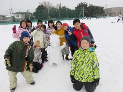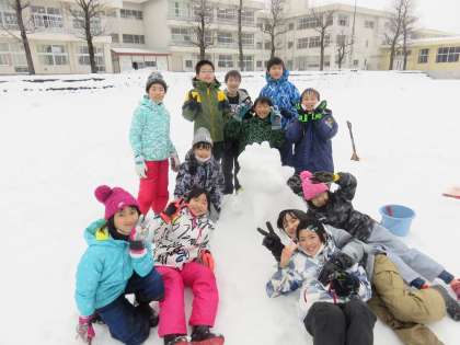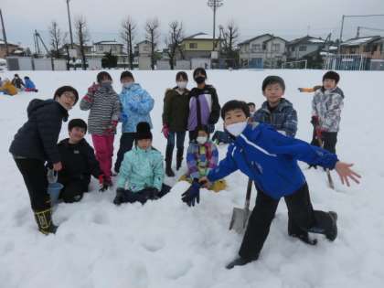 2学期に実施することができなかった集団宿泊学習の代わりに学年イベントとして雪像づくりをしました。テーマは山室中部のマスコットキャラクターである「やまちゅう」でした。グループに分かれてアイディアを出し合いながら、それぞれのやまちゅうを完成させました。