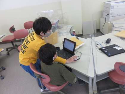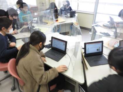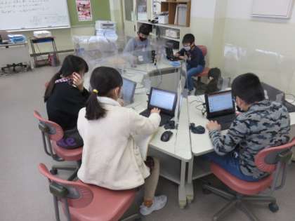 総合的な学習の時間では、「共に生きる」というテーマで福祉の学習をしてきました。3学期は、学習のまとめの学期です。調べたことをグループごとにパワーポイントでまとめています。相手にとって「見やすい」「分かりやすい」をキーワードに、文章を短くすることや写真を大きくすること、ひとまとまりの言葉で改行を入れることなど、一つ一つ考えながらまとめています。