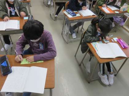 国語科「ありの行列」では、友達と感想を交流する学習を行いました。友達の感想を読み、それに対する自分の考えを付箋に書く活動では、自分の感想と比べながら一生懸命書いていました。友達と感想を交流することで、新しい見方が広がったようです。