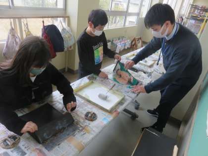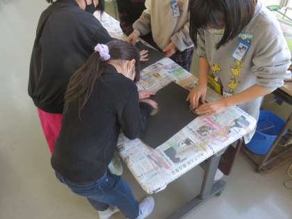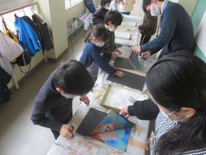 いよいよ3年生の版画は印刷に突入です。魔法の液(絵の具を水に溶かした物ですが・・・)を板に塗ると、あら不思議。紙に絵の具が印刷されるのです!ばれんで一生懸命こすって、紙をめくると「わぁ、きれい!」と驚きの声とともに嬉しそうな顔をする子供たち。今までの頑張りが作品となって現れ、大きな達成感を感じています。