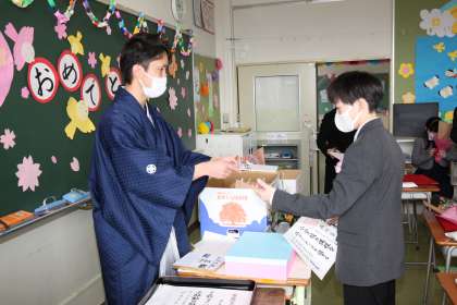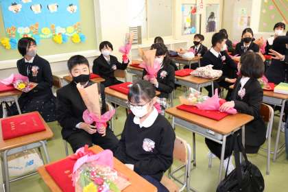 卒業式の後、教室へ戻ってきた様子です。涙を流している子ども、ほっとしている子、いろいろな姿が見られました。教室では、全員が卒業証書と花束を受け取りました。