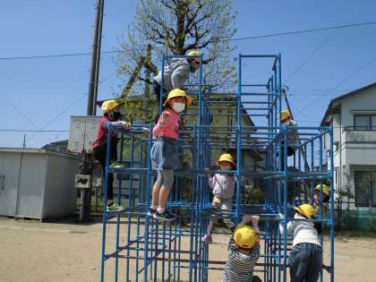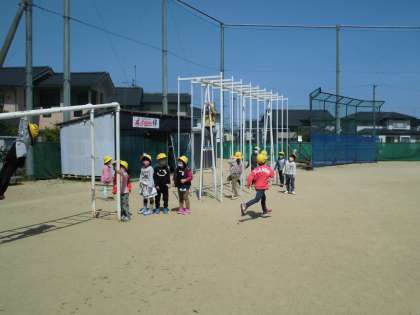 先日、グラウンドの使い方を教わった1年生。短い時間でしたが、遊具でも遊ぶことができました。暑いくらいのいい天気!青空の下、ちゃんと順番を守って、なかよく遊びました。