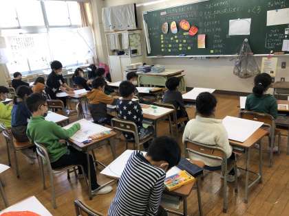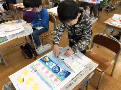 2年生初めての図工では「ふしぎなたまご」を描きます。「どんな色と形にしようかな」「たまごの中から何かとびだすかな」とそれぞれが豊かな想像を膨らませながら描いています。さすが2年生です。絵の具の準備や片付けの手際がとてもよく感心しました。
