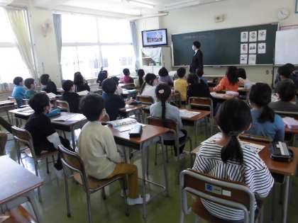 外国語ルームに移動し、外国語活動担当の先生との授業です。挨拶や自己紹介、質問など、英語で話されます。細かくは分からないけれど、何となく分かる様子の子供たち。先生が解説すると、「そういうことね」と笑顔になりました。