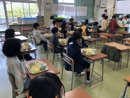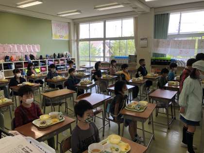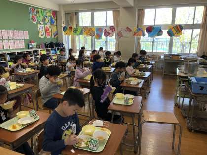 給食の時間は、お話をせず落ち着いて配膳し食べることを約束しています。楽しく会話はできないけれど、みんなで気持ちを一つに準備をし、味わって給食を食べています。写真は左から1組、2組、3組の様子です。
