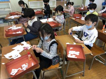 図工では「はさみのアート」の学習に挑戦しました。紙をいろいろな大きさに切って黒画用紙の上で組み合わせていきます。夢中になって切っていました。