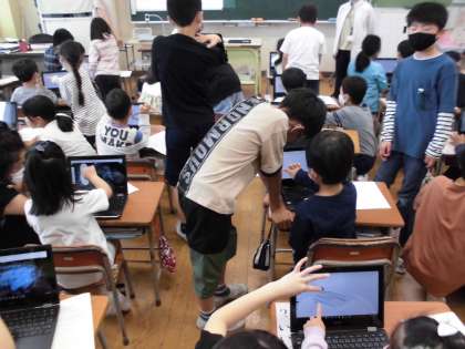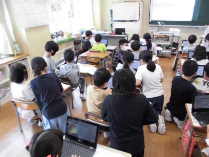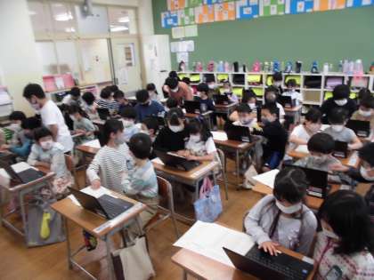 5年生にお手伝いをしてもらい、アンケートに答えました。5年生のお兄さん、お姉さんのサポートのおかげでスムーズに行うことができて、早く終わった子どもたちは、お絵かきソフトでお絵かきをしました。その中で、5年生から平仮名を教えてもらったり、たし算を教えてもらったりする姿もあり、とても有意義な時間を過ごしたようです。