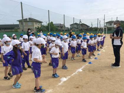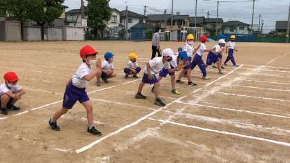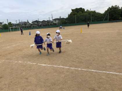 2年生の団体競技は「ちびっこハリケーン」です。3人で協力して棒をもち、コーンを回ります。3人で息を合わせることがとても難しく、今日の練習も大健闘!小さな体で棒を運ぶ姿、とっても可愛らしいです。来週は本番に向けてスタートの仕方、より速く回るためのこつをさらに練習していきたいと思います。土日にしっかり体を休めてくださいね!