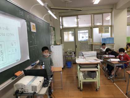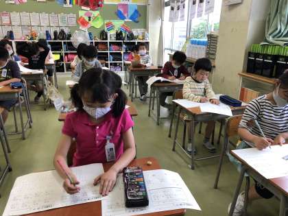 算数ではひき算の筆算の学習をしています。授業では友達に繰り下がりの方法を説明したり、プリントで筆算練習をしたりしています。「計算の途中でいろいろ考えることが多くて難しいな」と言いながらもくじけず頑張っています。定着するまでファイトだ2年生!
