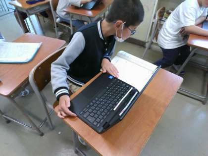 クロムブックを使ったローマ字のタイピング練習に集中して取り組んでいるところです。ローマ字の学習は2学期ですが、基本のルールを教えると、国語の教科書を片手に、ローマ字によるあいうえおを一生懸命打ち込んでいます。