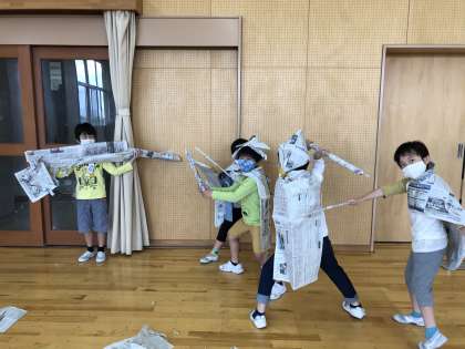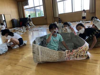 図画工作科では「新聞紙となかよし」の学習を進めています。写真は初めて取り組んだ様子です。新聞をやぶったり丸めたり・・・新聞紙となかよしになって豊かな発想を膨らませていました。