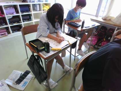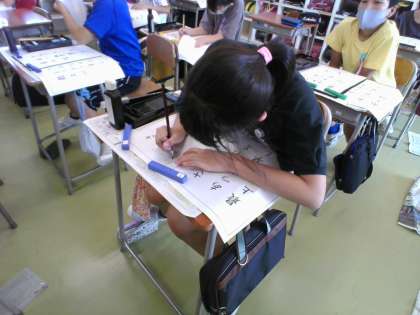 書写の学習では松尾芭蕉の有名な句「さみだれを あつめて早し 最上川」をバランスに気をつけて書く学習をしています。小筆を使い、真剣に書くことができました。