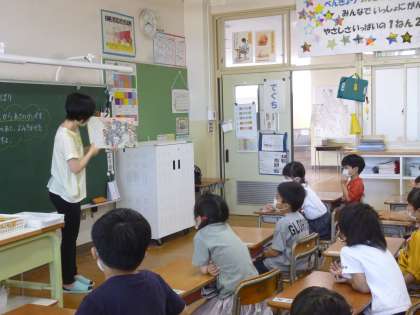 地域の方が、絵本の読み聞かせに来てくださいました。読んでもらったお話は、「ふしぎな やどや」。体を乗り出して絵を見つめながら、一生懸命聞いていました。「不思議なお話だった!」と子供たち。これからもいろいろなお話や本と出会い、世界を広げてほしいです。