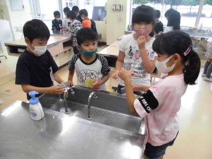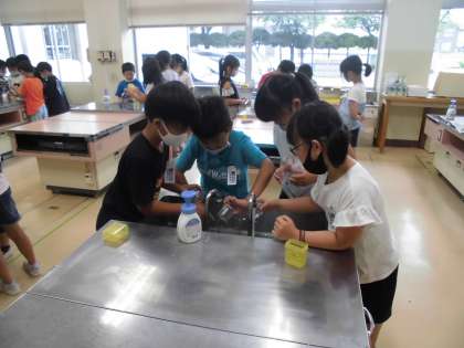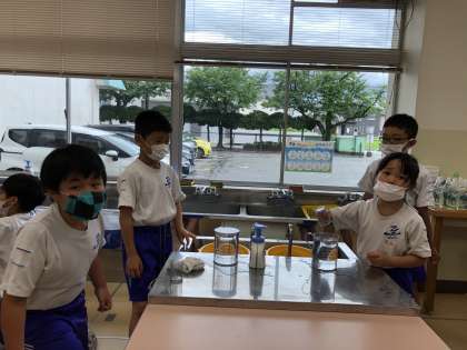 デシリットルます10杯分で、1リットルになるかを確認しています。「やったあぴったりだあ」と思わず歓声を上げる子どもたちです。