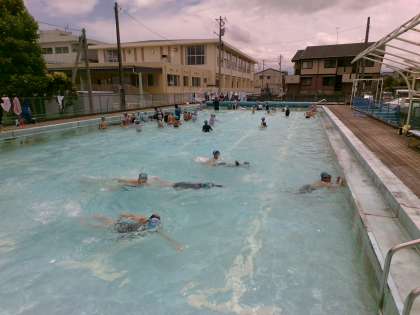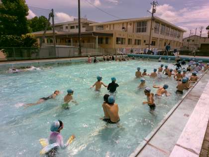 昨日のプール学習の様子です。雨の日が続きましたが、この時間は太陽も出て、楽しく活動しました。