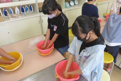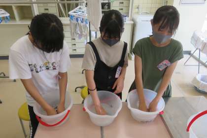 家庭科の洗濯体験、3組編です。靴下1枚ですが、汚れを落とすのは大変そうでした。おうちの方の苦労が分かったようです。