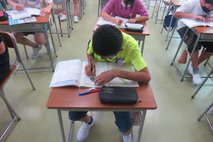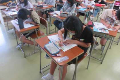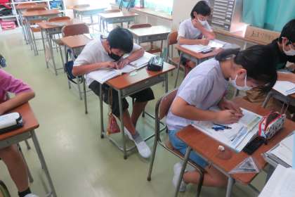 算数では拡大図、縮図の学習をしています。コンパスや分度器で縮図をかき、それを活用して色々な問題を解いています。集中して作図をしている子供たちです。