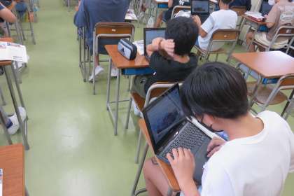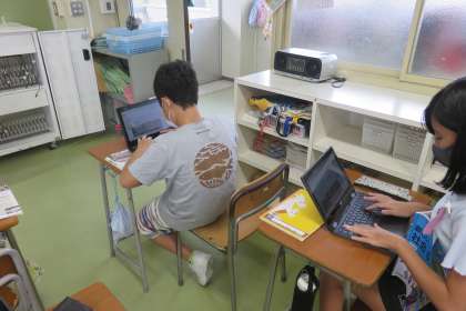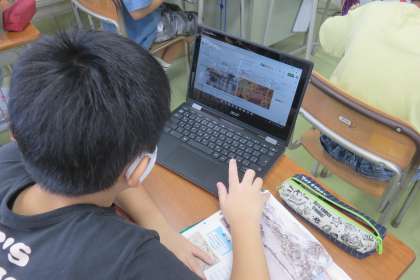 社会科では、室町時代の文化について学習しています。今日は墨絵と大和絵を比較し、墨絵や室町時代の文化の特徴についてスプレッドシートに書き込みました。友達の考えを同時に見ることができるので、自分の考えを書きやすいようで、どんどん書き込んでいました。「大和絵は豪華だけど、墨絵は落ち着いている」「大和絵のように色を使うこともできるのに、あえて白黒にしているんだね」「武士の文化なのかな」など、たくさんの気づきがある授業でした。