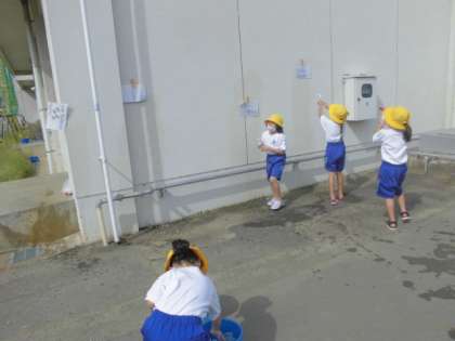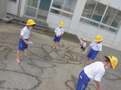 生活科「水や土で遊ぼう」の最後の活動、水遊びをしました。マヨネーズやケチャップ、ペットボトルといった空き容器に水を入れ、的当て、地面にお絵かき、水鉄砲の撃ち合い等、自分で考えた遊びをしました。「水をかけると、地面の色が変わって不思議」「1日中水遊びしたい!」という声があちらこちらから聞かれました。