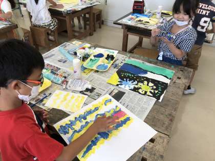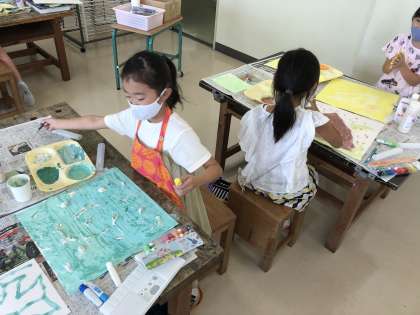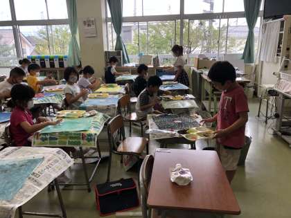 液体粘土を使って指や手で描く学習をしています。「手をうつしてみたよ」「絵の具の量を変えていろいろな点々を作ったよ」など様々な工夫を自分たちで見つけていました。