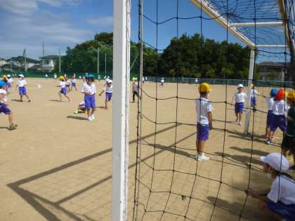 よく晴れた空の下、クラス全員でこおりおにやけいどろをしました。技セブンのシール獲得を目指し、「1回も捕まらないように逃げる」「1人でも多く捕まえる」ことができるように力いっぱい走りました。