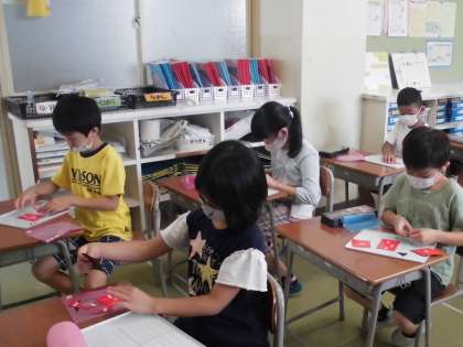 今日は3組で「いろいろな形の中から当たりくじを探そう」という、子供たちが挑戦したくなるような課題を提示し、三角形と四角形の違いを丁寧におさえました。