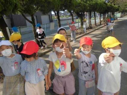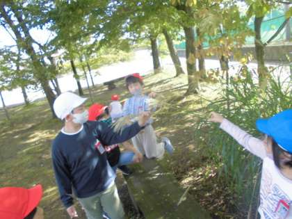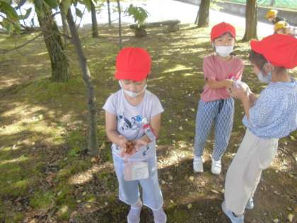 朝晩すっかり涼しくなり、秋を見つけに学校の周りを散歩しました。「落ち葉がいっぱい!」「桜の葉っぱが茶色だね」「すすきって秋だよね」と言って次々秋を見つけた子供たち。最後はたくさん落ちているドングリ探しに夢中になりました。