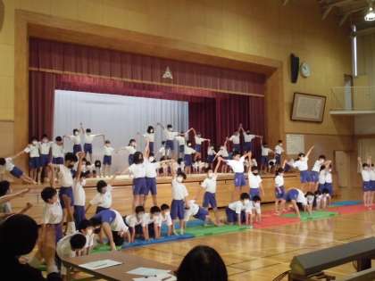 3グループの発表が終わり、全員がステージに上がりました。組体操の大技を決め、大きなスターがたくさんできました。