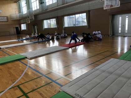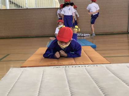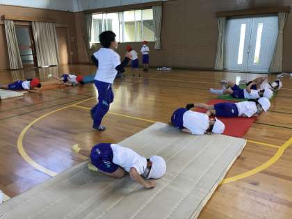 今週は「犬はしり」「わに歩き」「くま歩き」などの動物歩きにチャレンジです。腕や足だけで大きく動かしたり、小さくぐるぐる回ったり、体全体で一生懸命に取り組んでいました。「まずはやってみよう!」いう姿勢が素晴らしい子供たちです。