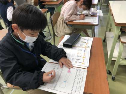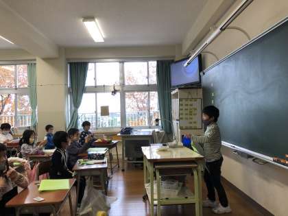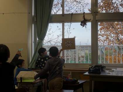 生活科では「うごくおもちゃを作ろう」を学習しています。作る目当ては「動くこと」「遊んでもらう相手のことを考える」です。写真はおもちゃの設計図を作りイメージを膨らませている様子、ゴムや風、空気の力を使って動く方法を紹介したりしている様子です。