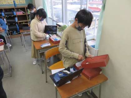 今回は道具箱の整理・整頓をしました。整頓前と後の道具箱をクロムブックで撮影し、整頓の工夫やこだわりについて発表しました。