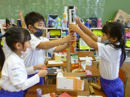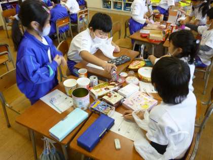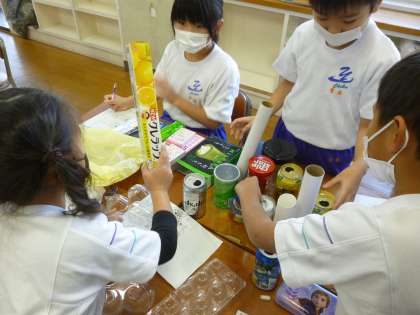 算数の授業で、「かたちのなかまわけ」に取り組みました。家から持ちよった空き箱や空き缶などを、学習した「はこのかたち」「つつのかたち」などの仲間に分けました。授業の終わりには、「つつのかたちは横に置くと転がるから縦に置かないと」「はこのかたちはどの向きでも高く重ねられる!」と、気付いたことを生かしながら高いタワーを作りました。協力して学ぶ姿が素敵でした。