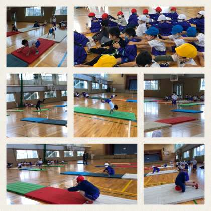 マット運動でいろいろな動物の動きに慣れてきた子供たち、今週は学年で前転後転、かえるの足うちに挑戦しています。かえるの足うちは足を振り上げてパチパチっと足で拍手をします。先生や友達をお手本に、挑戦していました。