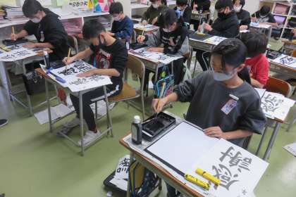 「感謝」の文字を習字で書いています。感謝を伝えたい人のことを思い出しながら、心を込めて書いている6年生の子供たちです。