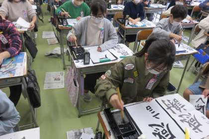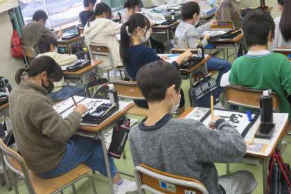 「感謝」の文字を習字で書いています。感謝を伝えたい人のことを思い出しながら、心を込めて書いている6年生の子供たちです。