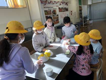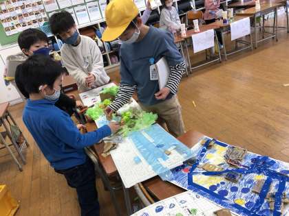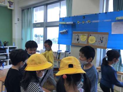 生活科では1年生を招待したおもちゃランドを企画しています。来週からクラスごとに毎週月曜日に開催することになりました。「1年生が楽しんでくれるといいな」とどきどきしながら一生懸命に準備をしています。写真はそれぞれのおもちゃコーナーをお互いにまわっている様子です。
